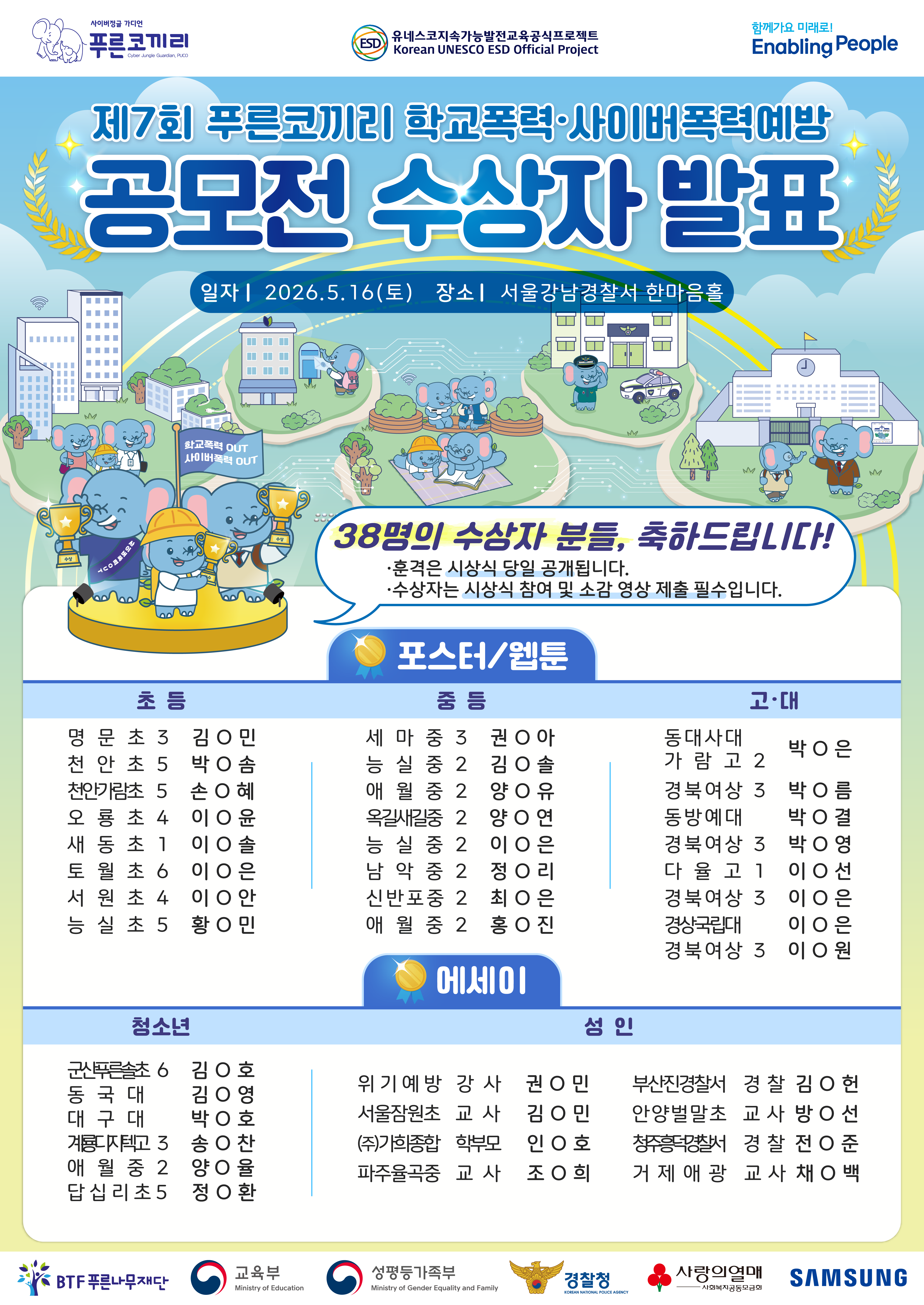 [안내] 2026 제7회 푸른코끼리 학교폭력·사이버폭력예방 포스터, 웹툰, 에세이 공모전 수상자 발표